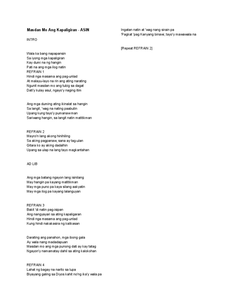 Refrain Bm G Hindi na masama ang. Reflection about the song masdan mo ang kapaligiran. Browse for Reflection On Masdan Mo Ang Kapaligiran song lyrics by entered search phrase.