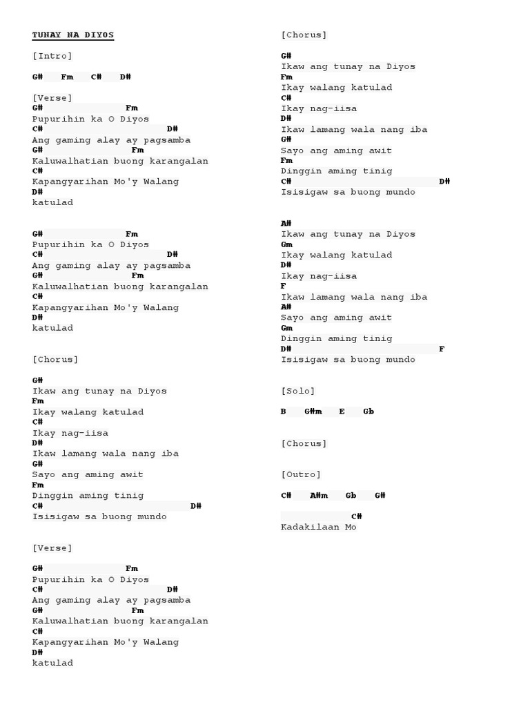 There are 60 lyrics related to Katapatan Mo O Diyos Tunay At Dakila Ang Pag. D Fm Dm KATAPATAN MO O DIYOS TUNAY AT DAKILA G Em Asus A ANG PAG IBIG MOY WAGAS AT WALANG KAPANTAY D D7 SA AMING PUSO SA AMING BUHAY G Em Gm PAPURIT PAGSAMBAY IAALAY D Bm Em BUKAS NOON NGAYON MAGPAKAILANMAN A D D7. Katapatan Mo O Diyos Lyrics and Chords D-Fm-Dm KATAPATAN MO O DIYOS TUNAY AT DAKILA G-Em-Asus-A ANG PAG-IBIG MOY WAGAS AT WALANG KAPANTAY D-D7 SA AMING PUSO SA AMING BUHAY G-Em-Gm.