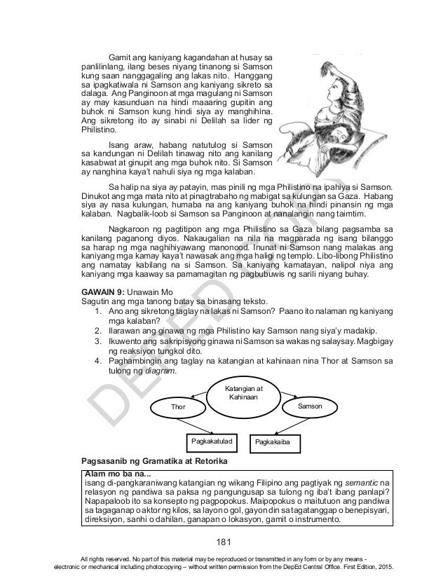 Balik-aral Itanong kung ano-anong mga gawaing pisikal ang kanilang natatandaan at natutuhan sa Ikatlong Baitang. 1 See answers Another question on Filipino. D EPED C O PY Filipino Modyul para sa Mag-aaral Kagawaran ng Edukasyon Republika ng Pilipinas Ang aklat na ito ay magkatuwang na inihanda at sinuri ng mga edukador mula sa mga publiko at pribadong paaralan at pamantasan.